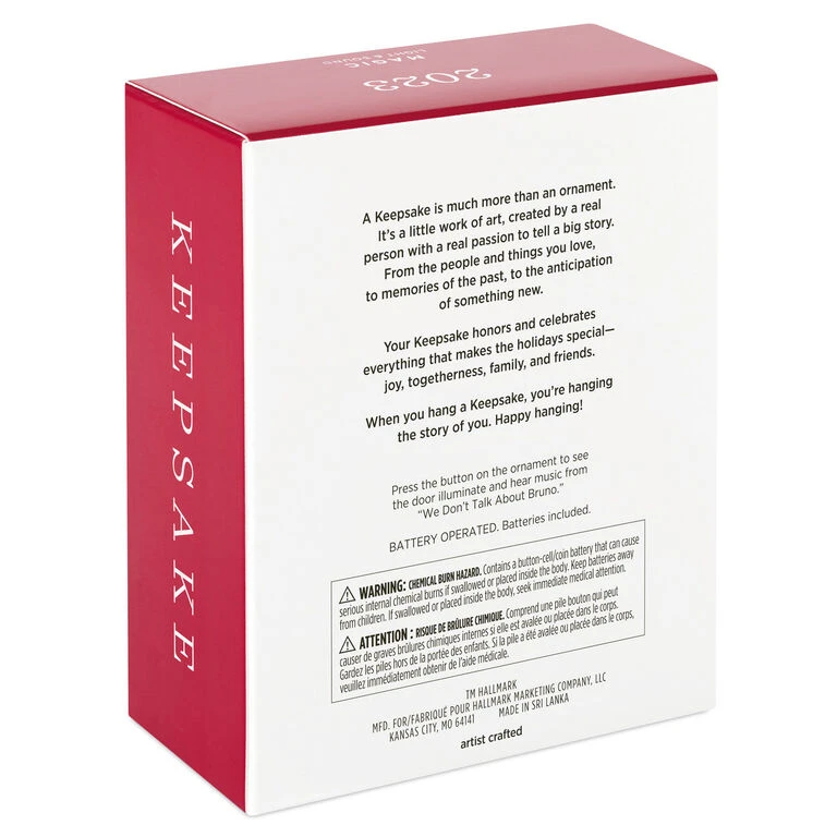 - Key Features: Press the button on the Magic Light and Sound ornament to see the door illuminate and hear music from “We Don’t Talk About Bruno.”