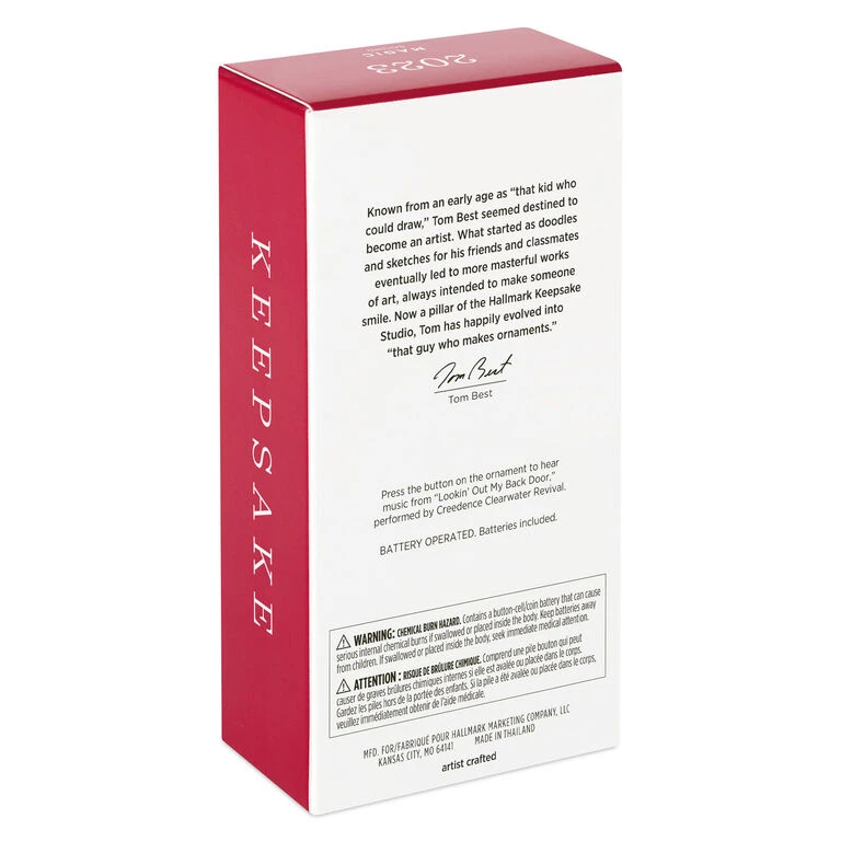 - Key Features: Press the button on the Magic Sound ornament to hear music from “Lookin’ Out My Back Door,” performed by Creedence Clearwater Revival.