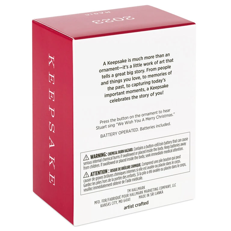 - Key Features: Press the button on the Magic Sound ornament to hear Stuart sing “We Wish You a Merry Christmas.”